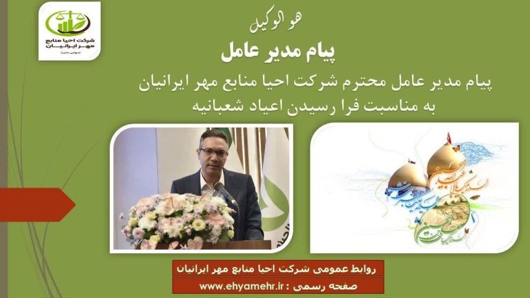 اینجانب فرا رسیدن اعیاد باشکوه شعبانیه را به تمامی پیروان اهل بیت عصمت و طهارت، به‌ویژه همکاران محترم شرکت احیا منابع مهر ایرانیان تبریک و تهنیت عرض نموده و از درگاه پروردگار متعال، توفیق روزافزون، اقتدار و بالندگی ایران عزیز را مسئلت دارم.